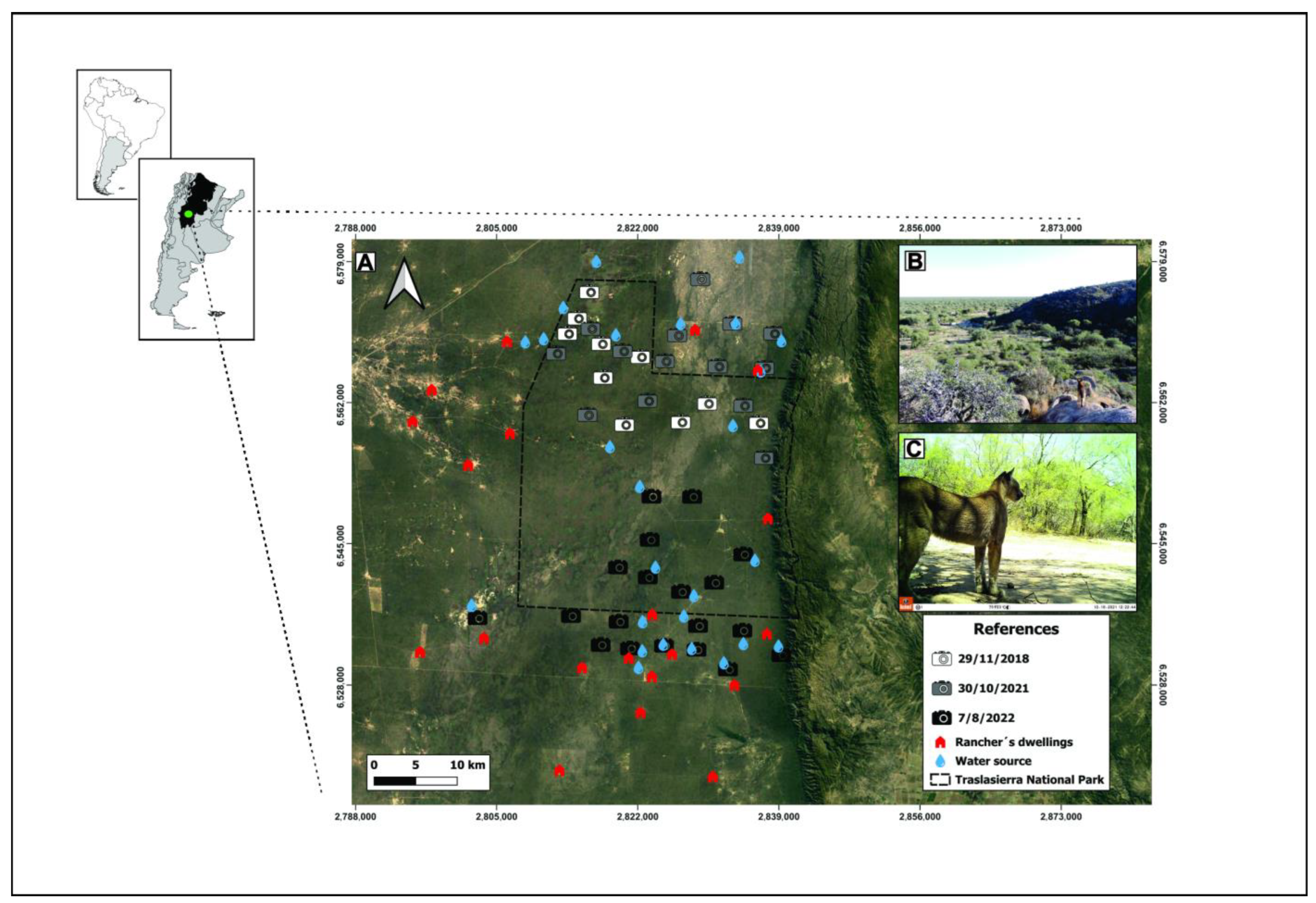 - Nanni, A.S.; Ghoddousi, A.; Romero-Muñoz, A.; Baumann, M.; Burton, J.; Camino, M.; Decarre, J.; Martello, F.; Regolin, A.L.; Kuemmerle, T. Mapping opportunities and barriers for coexistence between people and pumas in the Argentine Dry Chaco. Divers. Distrib. 2024, 30, e13920. [Google Scholar] [CrossRef]