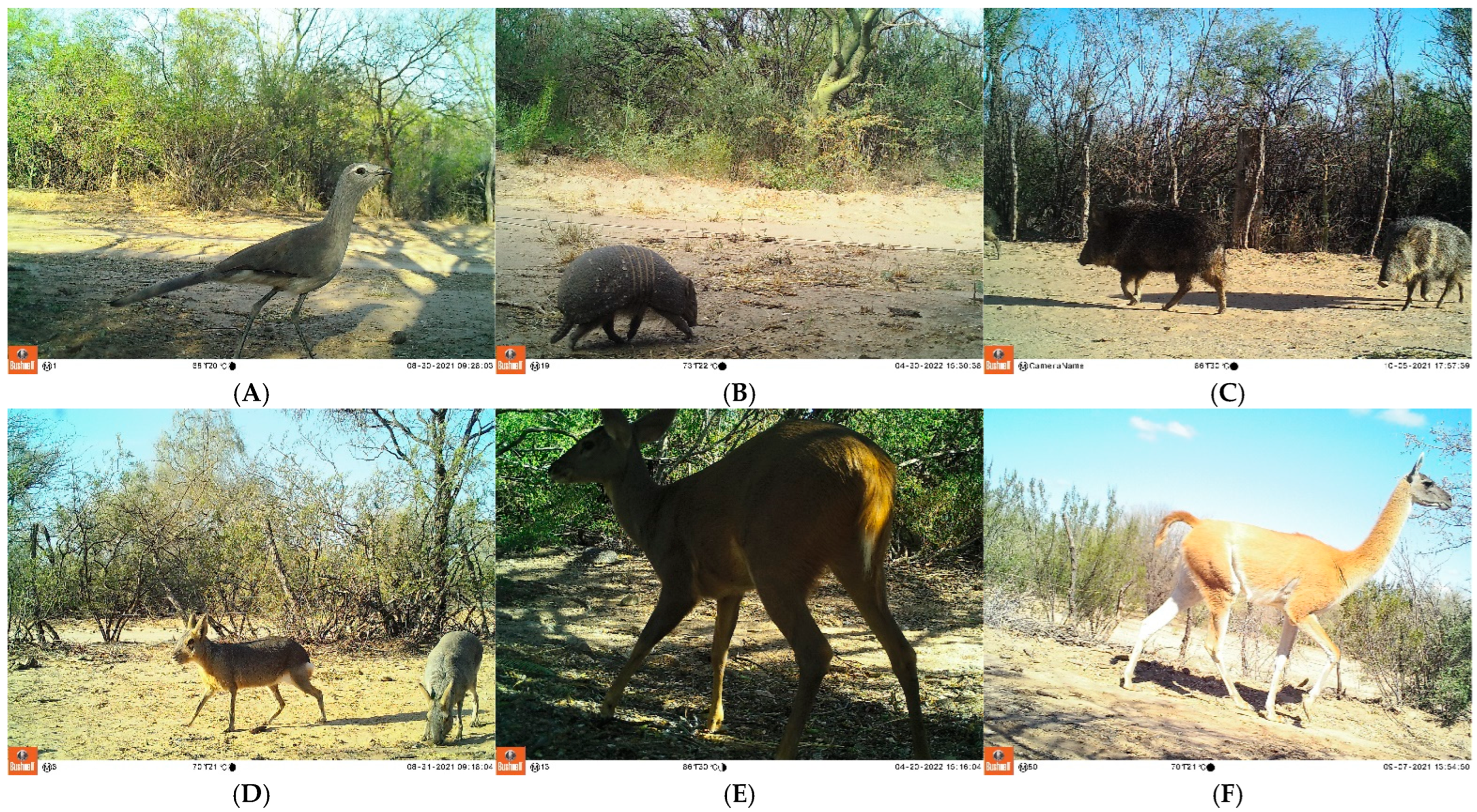 - Ontiveros, Y.; Cappa, F.M.; Andino, N.; Campos, C.M.; Borghi, C.E.; Giannoni, S.M. Mammal and bird diversity in a system of protected areas in Argentina. Biodiversity 2022, 23, 61–71. [Google Scholar] [CrossRef]