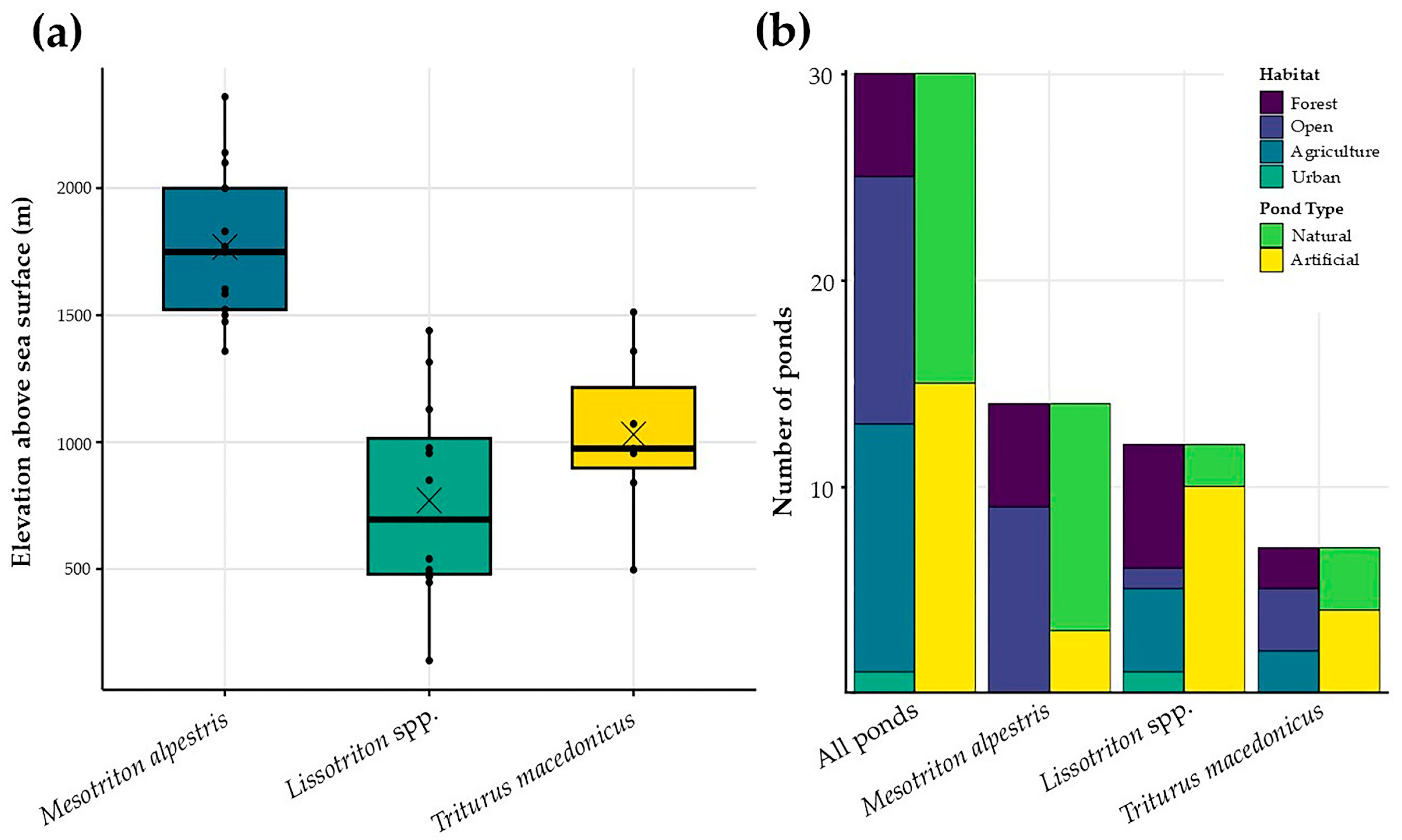 - Daftsios, T.; Sagonas, K.; Strachinis, I. Extending the known vertical distribution for the highly adaptive Triturus macedonicus (Karaman, 1922). Herpetozoa 2024, 37, 107–110. [Google Scholar] [CrossRef]