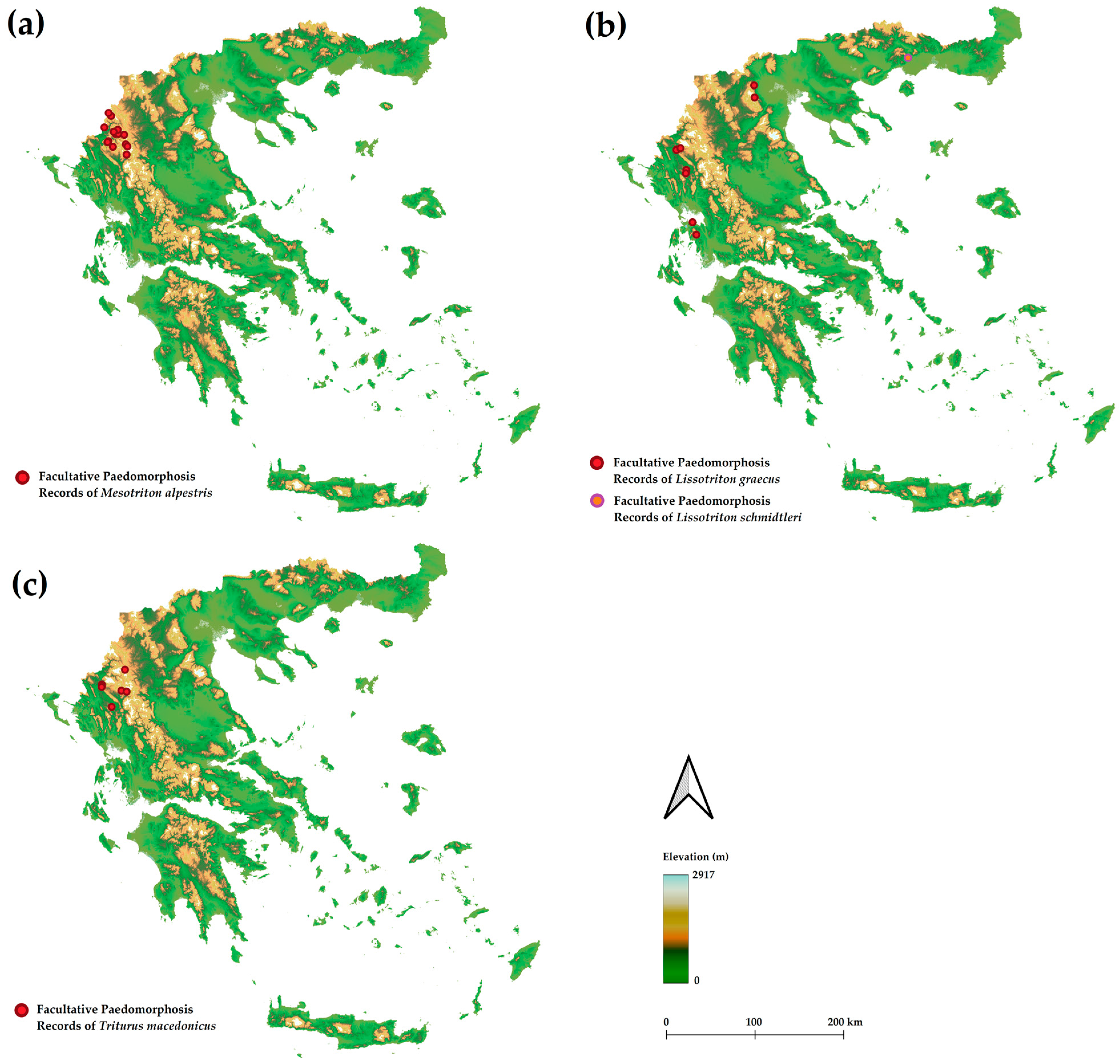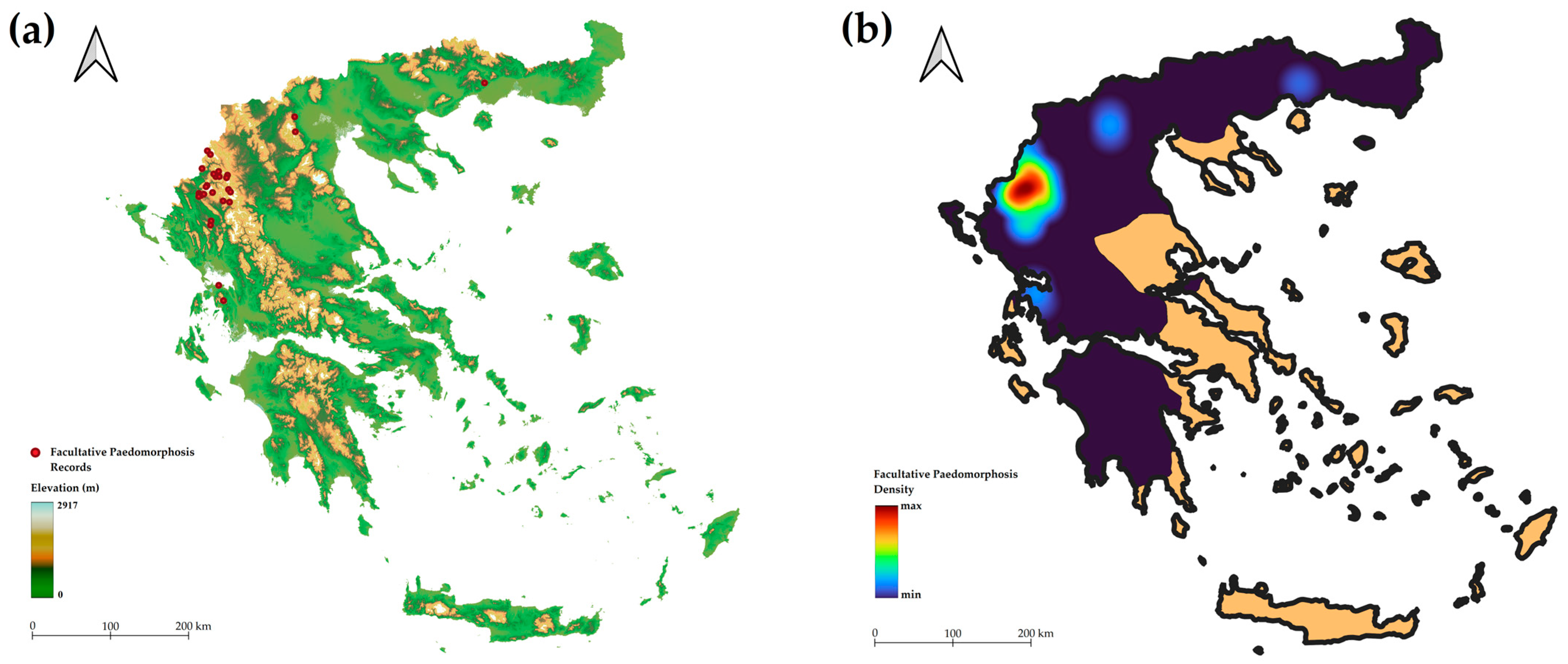 - Sotiropoulos, K.; Moustakas, K.; Konstantinidis, K.; Mantzana-Oikonomaki, V.; Siarabi, S.; Bounas, A. First record of facultative paedomorphosis in the Macedonian crested newt (Triturus macedonicus) and an additional record for the Greek smooth newt (Lissotriton vulgaris) from Greece: Implications on species conservation and preservation of alternative ontogenetic trajectories. Herpetol. Notes 2017, 10, 255–260. [Google Scholar]