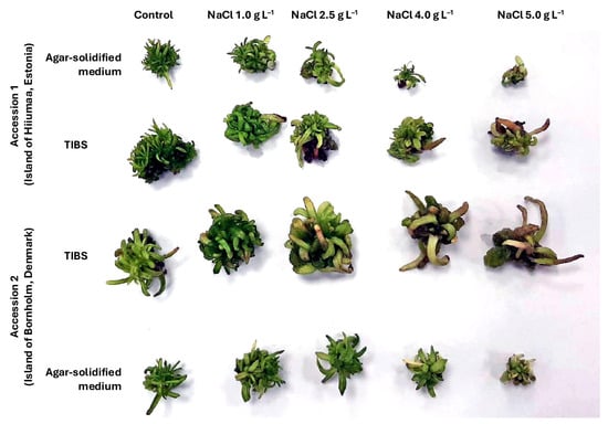 Tripolium pannonicum explants of two accessions, cultivated for 4 weeks with different NaCl concentrations and growth conditions. TIBS, temporary immersion bioreactor system. Photo by L. Purmale-Trasūne. Modified from [165].