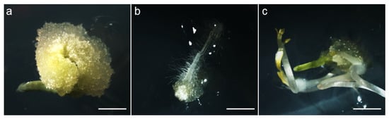 - Xu, K.-D.; Wang, W.; Yu, D.-S.; Li, X.-L.; Chen, J.-M.; Feng, B.-J.; Zhao, Y.-W.; Cheng, M.-J.; Liu, X.-X.; Li, C.-W. NAA at a high concentration promotes efficient plant regeneration via direct somatic embryogenesis and SE-mediated transformation system in Ranunculus sceleratus. Sci. Rep. 2019, 9, 18321. [Google Scholar] [CrossRef] [PubMed]