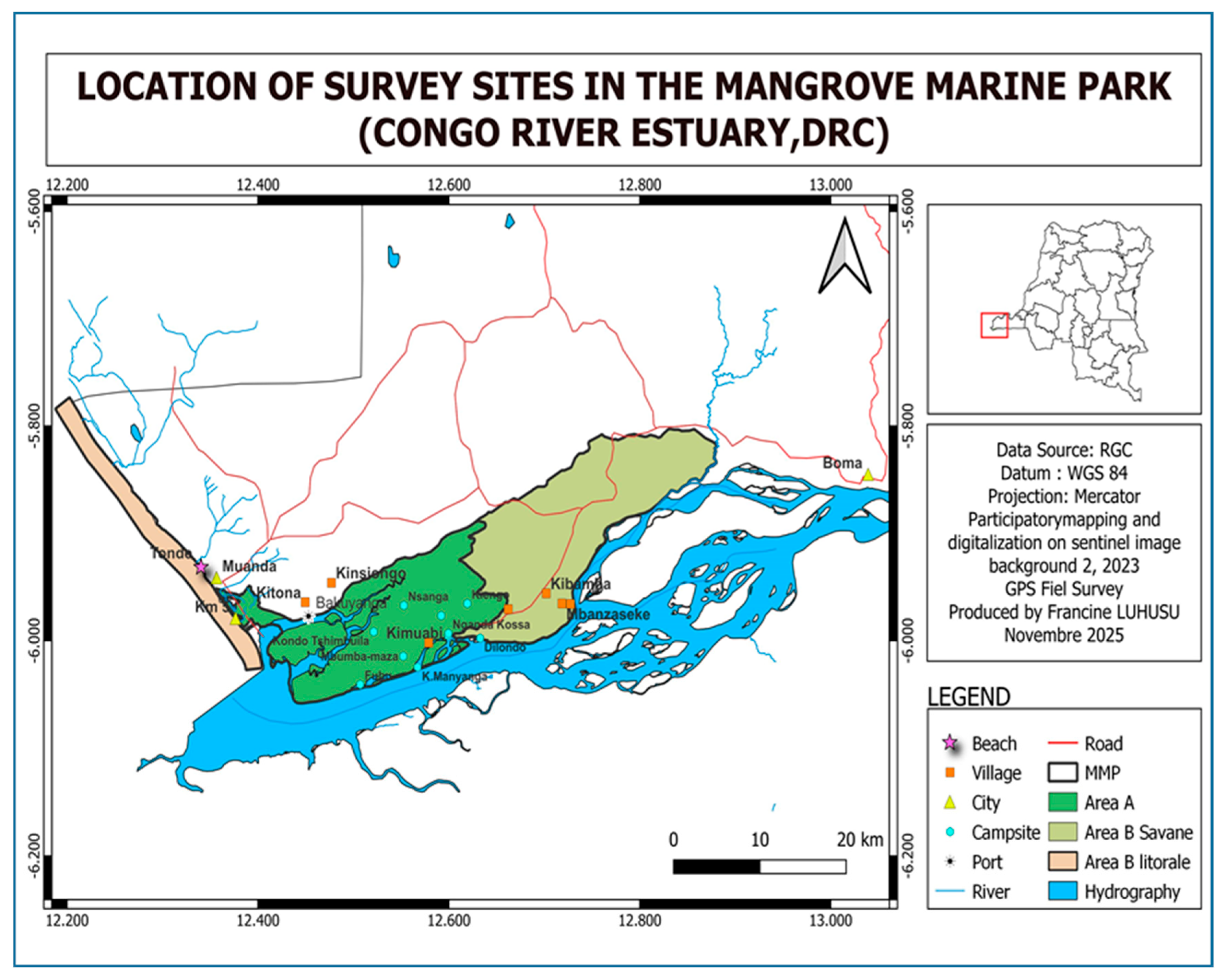 - Vambi, N.B.; Subi, M.O.; Tasi, M.J.P. Ruée vers les ressources halieutiques dans le Parc Marin des Mangroves à Muanda en République Démocratique du Congo. Rev. Afr. Environ. Agric. 2018, 1, 21–28. [Google Scholar]
