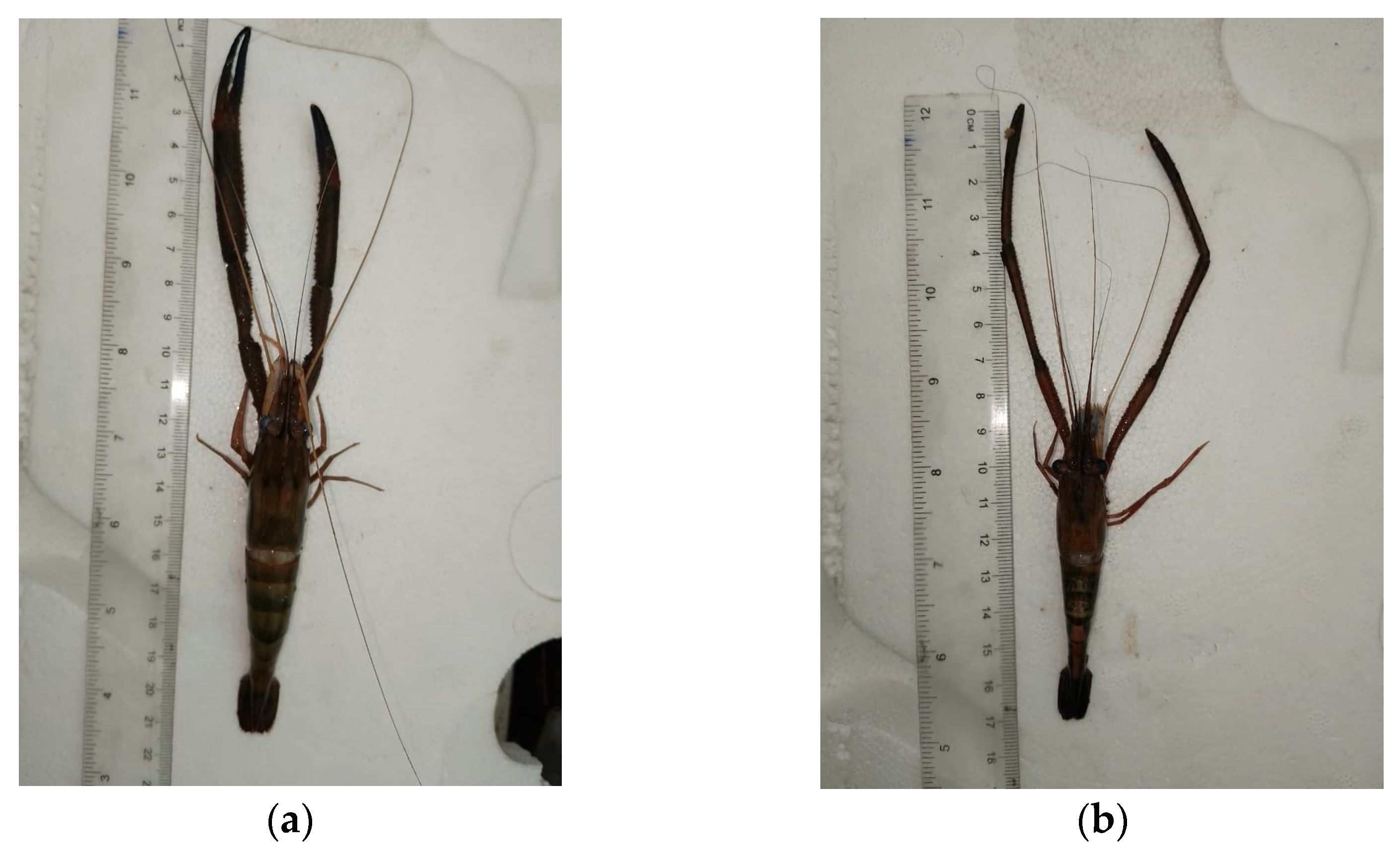 - Koussovi, G.; Niass, F.; Bonou, C.A.; Montchowui, E. Reproductive characteristics of the freshwater shrimp, Macrobrachium macrobrachion (Herklots, 1851) in the water bodies of Benin, West Africa. Crustaceana 2019, 92, 269–294. [Google Scholar] [CrossRef]