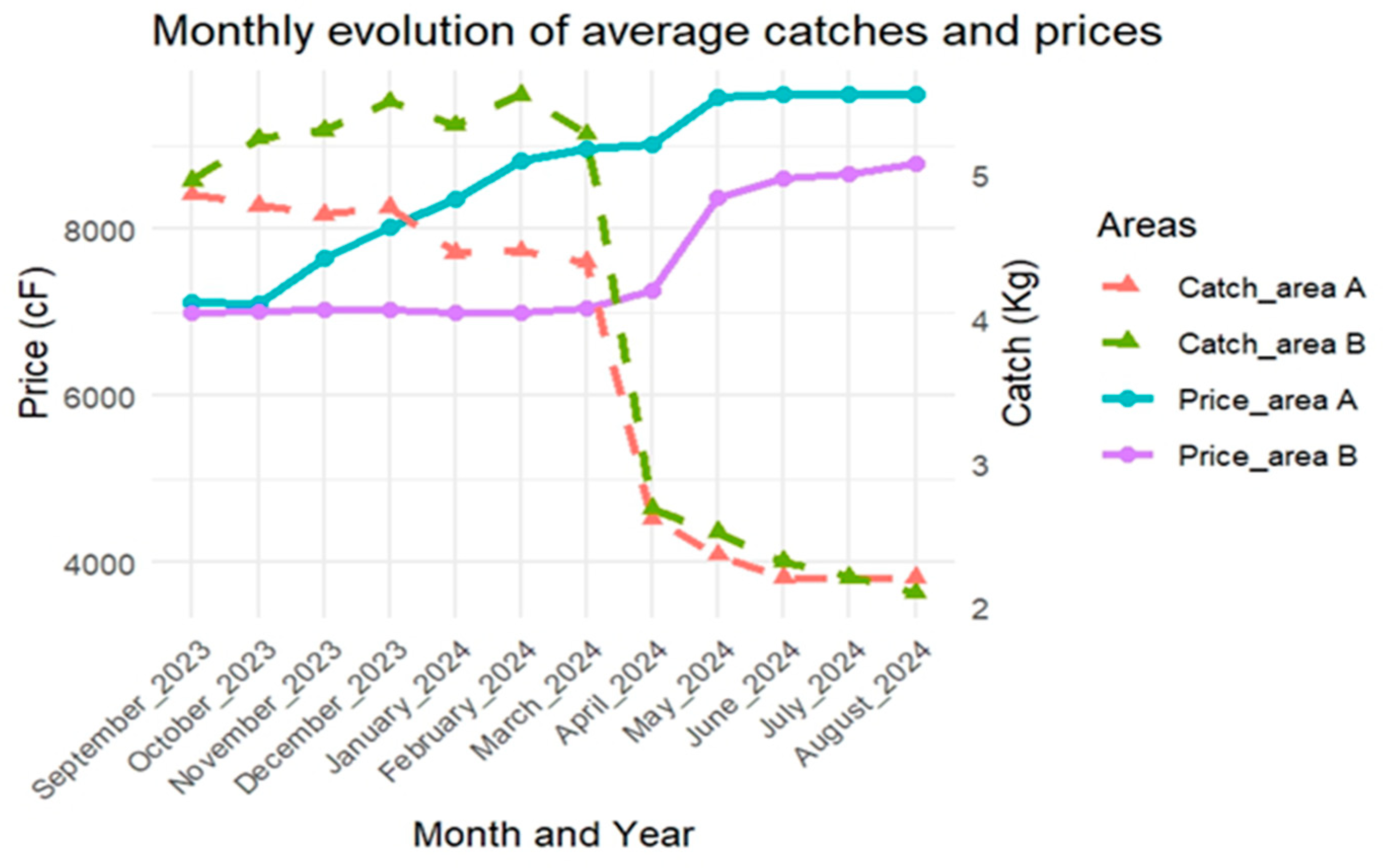 3.1.3. Temporal Trends in Catches and Prices of Macrobrachium spp. from September 2023 to August 2024