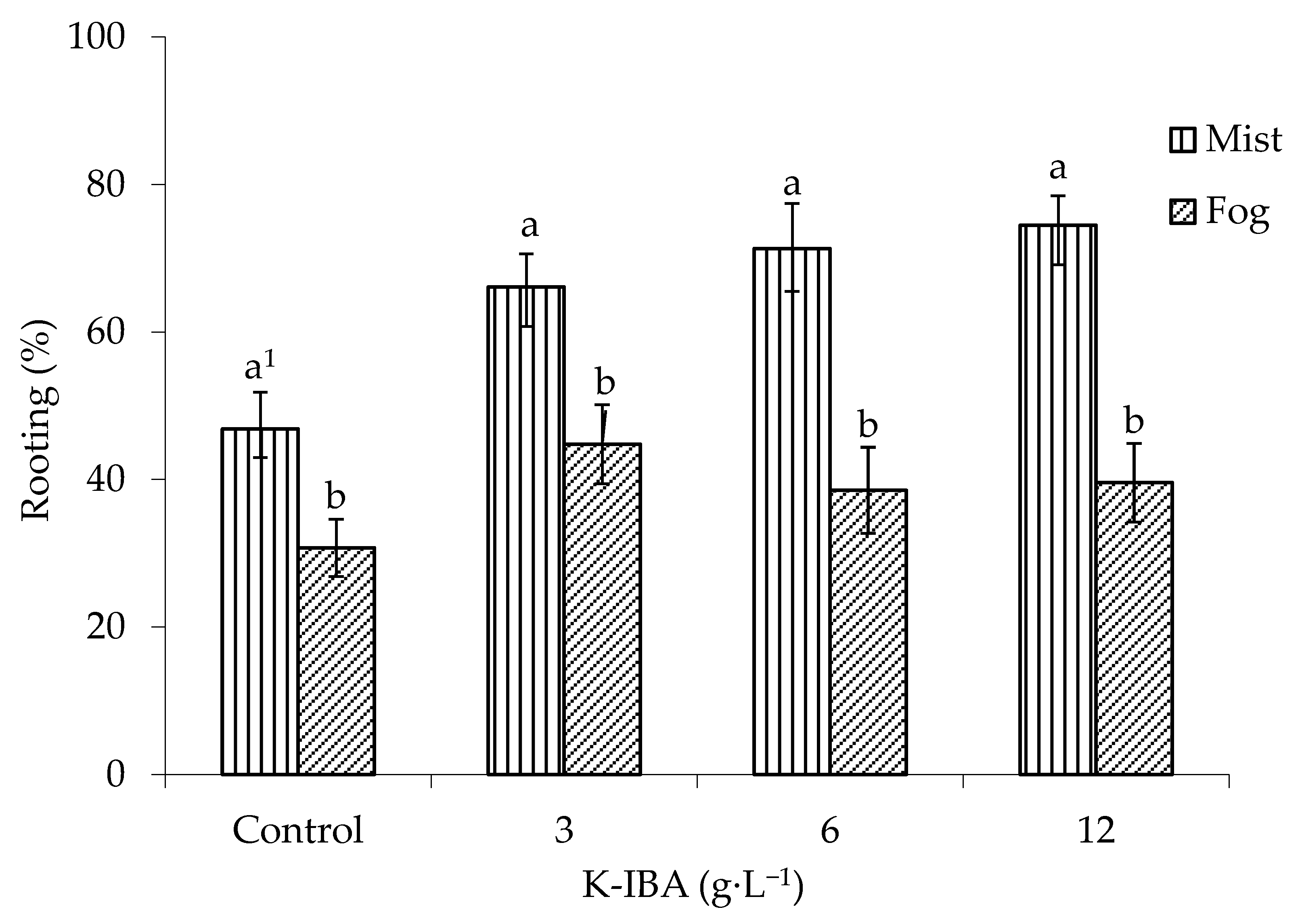 - K-IBA application significantly increased rooting in both propagation systems; optimal concentrations range from 3 to 12 g·L−1 depending on the system used.