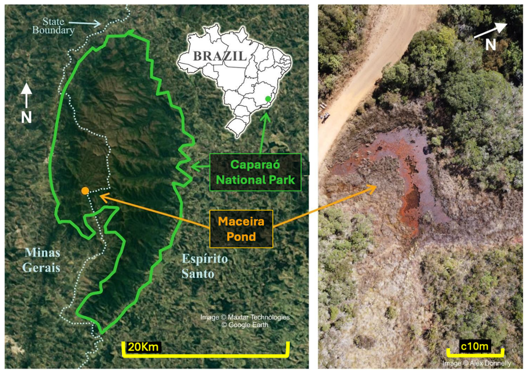 - Zornosa-Torres, C.; Augusto-Alves, G.; Lyra, M.L.; da Silva Júnior, J.C.; Garcia, P.C.A.; Leite, F.; Verdade, V.; Rodrigues, M.T.; Gasparini, J.L.; Haddad, C.F.; et al. Anurans of the Caparaó National Park and surroundings, Southeast Brazil. Biota Neotrop 2020, 20, e20190882. [Google Scholar] [CrossRef]