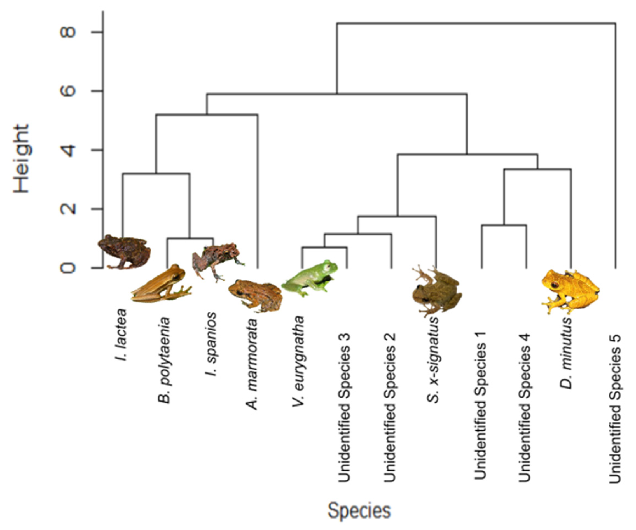 - Preininger, D.; Boeckle, M.; Freudmann, A.; Starberger, I.; Sztatecsny, M.; Hodl, W. Multimodal signalling in the Small Torrent Frog (Micrixalus saxicola) in a complex acoustic environment. Behav. Ecol. Sociobiol. 2013, 9, 1449–1456. [Google Scholar] [CrossRef]