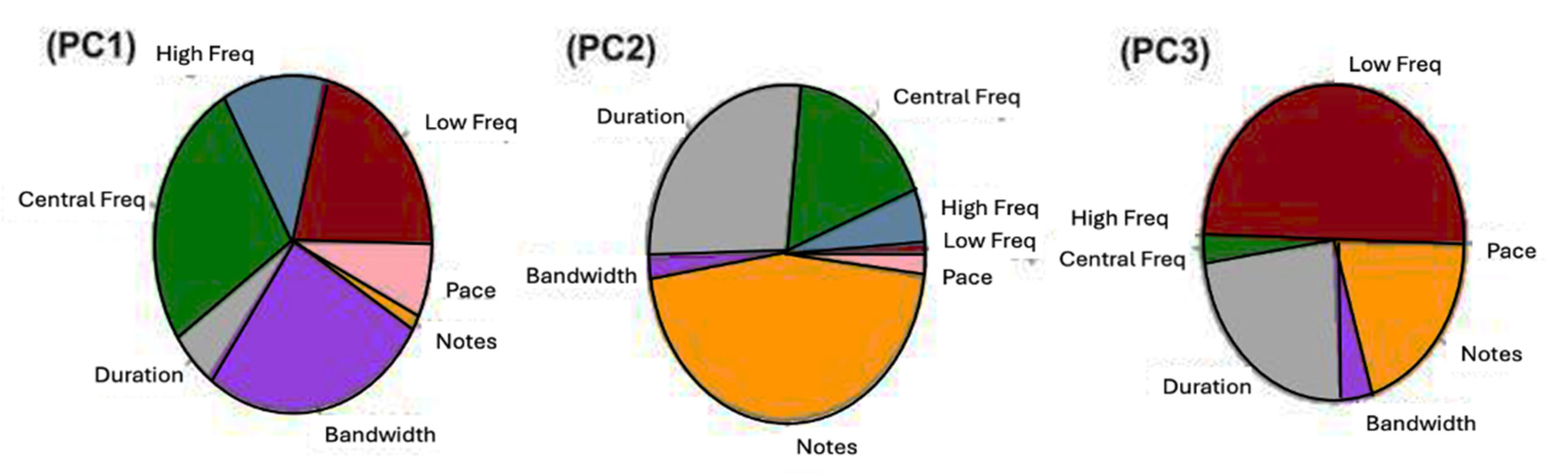 | Species | Low Freq. (Hz) | High Freq. (Hz) | Peak Freq. (Hz) | Centre Freq. (Hz) | Bandwidth (Hz) | Duration (s) | Notes | Pace (Notes/s) |