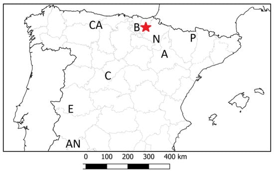 Map of Spain indicating provincial divisions and the administrative and geographic regions mentioned in the text. The red star marks the capture site of the ten griffon vultures tagged with GPS/GPRS-GSM transmitters. B (Basque Country), N (Navarre), A (Aragón), C (Castile), E (Extremadura), AN (Andalusia), CA (the Cantabrian mountains) and P (the Pyrenees). A graphical scale (km) is shown.