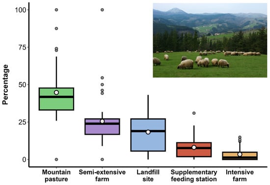 Percentage of PFEs (n = 2046) according to the resource type exploited, including landfill sites (n = 456), supplementary feeding stations (n = 196), mountain pastures (n = 864), semi-extensive farms (n = 446), and intensive farms (n = 84) throughout the annual cycle. Boxes represent the 25th and 75th percentiles, horizontal lines indicate the medians, whiskers show the variability, and points denote outliers. The white circle indicates the mean. The inset image showcases a representative landscape near the vultures’ breeding colony and capture site. Photo: M.Arrazola/Gobierno Vasco.