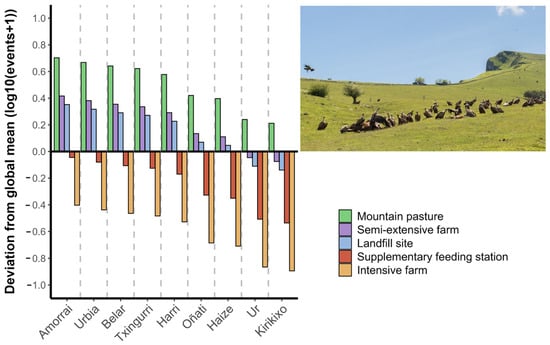 In terms of the species consumed, sheep and horses predominated in semi-extensive farms. In industrial farms, pigs were the main resource, followed by cattle, reflecting the proportions of the national livestock housed in intensive systems. Unfortunately, it was not possible to get data on the species consumed in the mountain pastures, because livestock roam relatively free in these areas, and a certain carcass cannot be attributed to a particular herd, unless confirmed in the field.