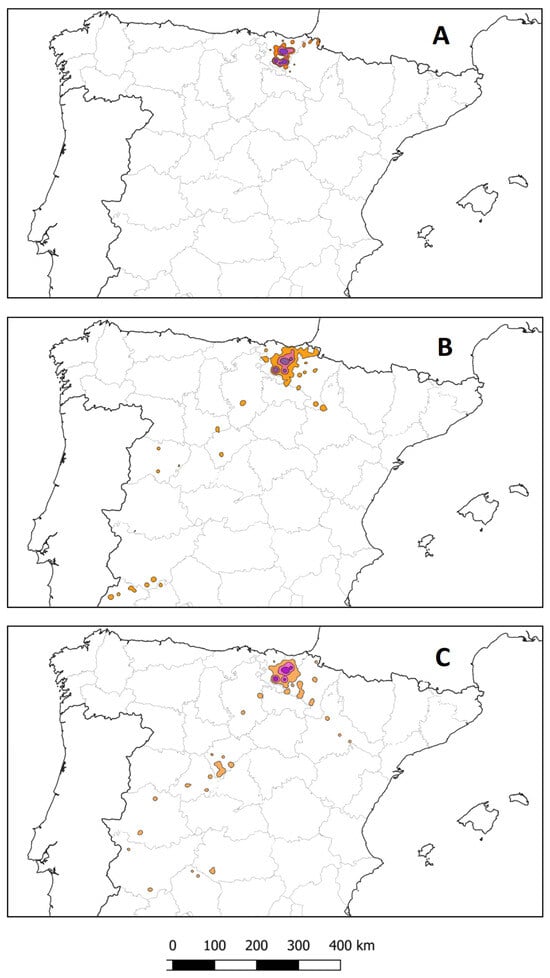 Kernel density estimates (KDEs) of 50% (purple), 75% (pink) and 90% (orange) of the PFEs identified (all individuals combined) during the pre-laying and incubation (A), rearing (B) and post-rearing (C) phenological phases. Maps of Spain include provincial divisions. A graphical scale (km) is shown.