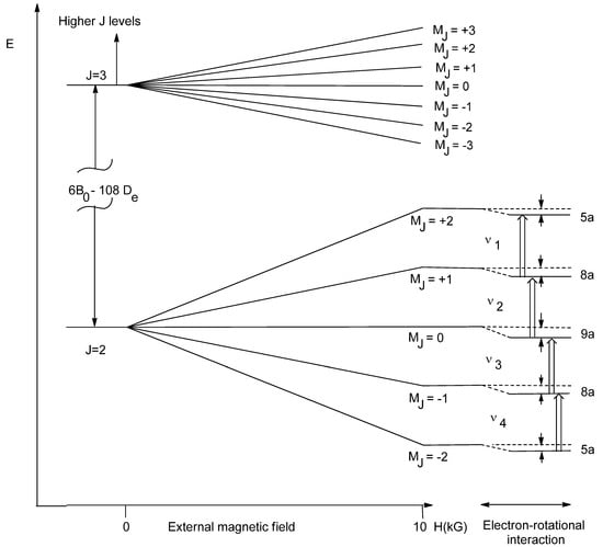 In the absence of electron-rotational interaction, all four EPR transitions in the ground state (J = Λ = 2) of the singlet (1Δg) dioxygen would be observed at the same field about H ≈ 10 kG with the frequency (9624.92 MHz) of X-band ESR spectrum. Transition energies hνi in the EPR spectrum (Figure 1) are different (at a fixed field H) because of perturbations from the upper rotational J = 3 levels (see Figure 2 below). They are equal to 0.65597 for (−2 → −1) transition, 0.66264 (−1 → 0), 0.66954 (0 → +1) and 0.67667 (+1 → +2) in the units [,], see Table 2 below. Thus, we have almost symmetrically split quartet EPR lines (Figure 1). At the fixed microwave frequency ν = 9.62492 GHz, the ESR X-band resonance signals are obtained at the magnetic field strength of about 10 kG, respectively []. The account of interaction with the first excited rotational level R = 1(J = 3) provides additional corrections to MJ sublevels of the ground rotational state J = 2 in the second-order of perturbation theory; the results are presented in Figure 2 below [].