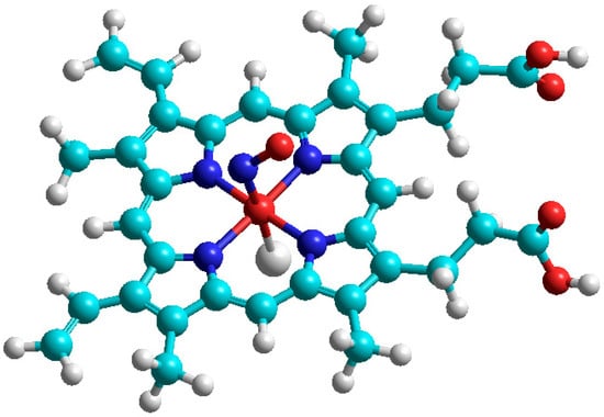 The model of the 2NO adduct with hemoglobin (coordinated with Cl- anion as a model of protein residue). Red color for O and Fe atoms, dark blue N, blue C, and grey for H atoms. Adapted from ref. []. This is also a calculation made for this paper.