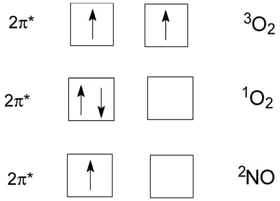 It is interesting to note that in homonuclear dioxygen molecules, all EDT’s are strongly forbidden by the central point (inversion) symmetry and only weak MDT are observed in the low-pressure gas phase in the triplet–singlet b-X and a-X transitions in the visible and near IR regions []. However, the release of symmetry restriction in solvents permits the O2 (X3Σg−)- O2 (a1Δg) band at 1.2 μm to acquires EDT character and become much more intense because of strong spin–orbit coupling inside the dioxygen O2 (πg) open shell. Thus, many peculiarities of the optical and EPR spectra of two diatomic species, 2NO and O2, being very important for atmospheric problems, strongly depend on spin–orbit coupling in 2π*- orbitals (Scheme 1) which energy does not exceed 1–2 kJ/mol [,].