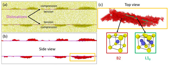 Turlo and Rupert [6] were the first to capture linear complexion states with atomistic simulations by analyzing solute segregation and nanoscale phase transformations at edge dislocations in the bcc Fe-Ni system. By exploring the wide space of temperatures and compositions, these authors discovered that Ni segregation to the compression side of the dislocation core can lead to the formation of nanoscale precipitates composed of one (B2-FeNi), two (B2-FeNi and L10-FeNi), or even three (B2-FeNi, L10-FeNi and L12-FeNi3) intermetallic phases, with the B2 phase being metastable and not present on the bulk Fe-Ni phase diagram [6,7]. By using the high-performance Monte Carlo code developed by Sadigh et al. [5], these authors were able to extend the size of the systems along the dislocation lines, proving the presence of a narrow region on the equilibrium phase diagram corresponding to the formation of linear complexions [6]. As shown in Figure 1, such linear complexion states were formed at the dislocation segregation zones (compression side) as nanoscale regions of elevated composition (Figure 1a) with local chemical ordering corresponding to B2 (red) and L10 intermetallic phases (green) in Figure 1b,c.