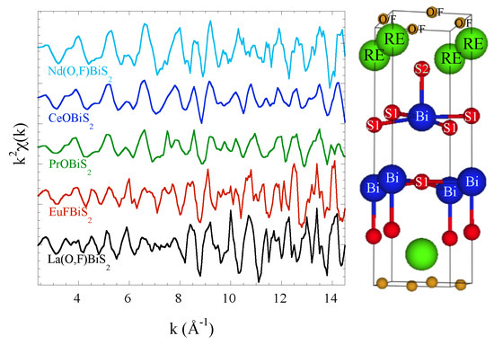 EXAFS oscillations of RE(O/F)BiS single crystals samples (RE = La, Eu, Pr, Ce, Nd) measured at Bi L-edge with X-ray polarization parallel to the crystallographic ab-plane. The oscillations are weighed by to amplify the signal at higher k-values and vertically shifted for a better visualization. The crystal unit cell of RE(O/F)BiS is also shown.