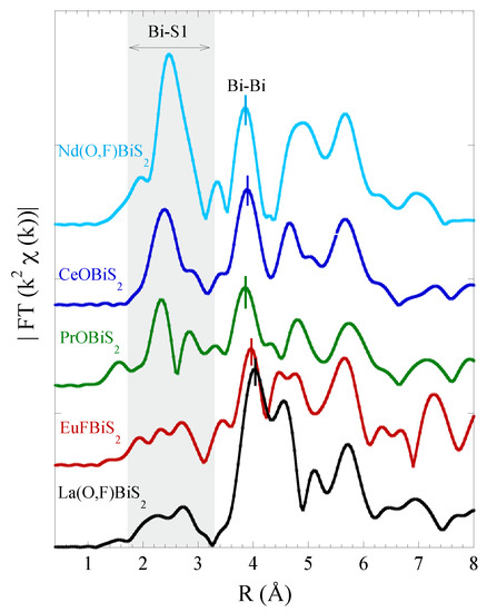 The Fourier Transform (FT) magnitude of the -weighted EXAFS oscillations is shown in Figure 2, providing real-space information on the local atomic distribution around the photoabsorbing Bi. In the RE(O/F)BiS structure, the Bi atom is coordinated with one axial sulfur atom (S2) and one sulfur of the twin BiS layer, however, their contributions are minimum in the EXAFS measured with polarization parallel to the crystallographic ab-plane. Therefore, the nearest neighbor contribution, at 2–3 Å, is mainly coming from the four in-plane sulfur atoms (S1) since the polarization vector of the X-ray beam plane [32,34]. The contribution appears as peak structures in the FT magnitude at ∼2.5 Å. The peak structure ∼4 Å is mainly due to the Bi-Bi bonds within the plane, representing the in-plane lattice parameter in RE(O/F)BiS structure. Apparently the Bi-Bi peak shifts and follows the in-plane lattice behavior in the tetragonal RE(O/F)BiS structure. The lattice parameters of the studied crystals are summarized in Table 1 [28,29,30,35]. The distant peaks beyond ∼4 Å include contribution of Bi-RE and diagonal Bi-Bi distances including also multiple scattering contributions.