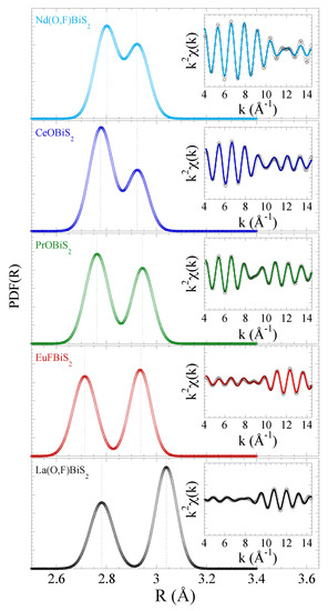 Here the aim is to quantify the distortions in the BiS-layer and for the purpose the contribution of Bi-S1 was Fourier filtered in the R-window (1.5–3.5 Å) shown as shadowed region in Figure 2. The shapes of filtered EXAFS oscillations, shown in Figure 3 (inset), are significantly different between them indicating that the local Bi-S1 distribution in RE(O/F)BiS evolves largely with RE(O/F)-spacer layer. We have evaluated the pair distribution function (PDF) of the Bi-S1 bonds from the analysis of the filtered EXAFS. The EXCURVE 9.275 code (with calculated phase shift functions and backscattering amplitudes) was used for extracting the PDF [36] starting from a model containing a distribution of harmonic oscillators describing the Bi-S pairs. The final Bi-S1 distribution was merged in a two peak function for all the samples (Figure 3) confirming that BiS-layer in these materials is characterized by a ferroelectric or quasi ferroelectric-like distortion [20,21,22]. Similar Bi-S1 distribution was obtained by constrained EXAFS model fits in which residual contribution of axial Bi-S2 bonds was included together with the in-plane Bi-S1 bonds respecting the effective number of near neighbors expected from the polarization dependence of L-edge EXAFS [32,34]. The corresponding theoretical signals are included as solid lines with the filtered EXAFS as insets. It is worth mentioning that such a distortion corresponds to atomic displacement within the BiS-layer. On the basis of first principles calculations a spontaneous in-plane ferroelectric polarization has been suggested [37].