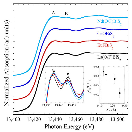 The differences in the XANES features can be seen in the inset displaying a zoom-over the peaks A and B. Apparently, the peak A moves towards higher energy from La(O/F)BiS to Nd(O/F)BiS while the peak B tending to shift towards lower energy with an exchange of the spectral weight. Here, the spectral weight transfer is estimated by normalized intensity difference between the two peak features (I − I/I + I) and plotted as a function of the distortion amplitude determined by EXAFS (Figure 3) and shown in the inset (right) of Figure 4. The intensity difference shows a gradual decrease as a function of the distortion in the BiS-layer. Although, due to complexity of the distortions in these materials, it is difficult to establish a quantitative correlation between the distortions and the spectral weight transfer in the XANES spectra, the observed change in the local geometry can be taken as a marker for the local distortions.