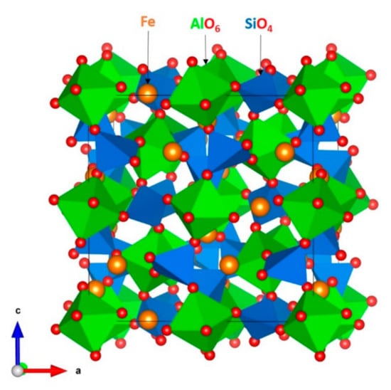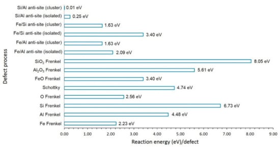 The defect energies are reported in Figure 2. The most favourable defect is the Al–Si antisite defect cluster, indicating that a small amount of cation mixing will be present. The antisite defect cluster has been found in many oxide materials [45,46,47]. Other antisite defect cluster energies are lower than the Frenkel and Schottky defect energies. However, they are possible only at high temperatures. In all antisite defect clusters, energies are lower than their corresponding isolated forms. This is due to the aggregation of isolated defects forming a cluster with exoergic binding energy. The Fe Frenkel defect energy is 2.23 eV/defect. This defect is important, as it can facilitate the formation of Fe vacancies and vacancy-assisted Fe diffusion. The O Frenkel is higher by 0.34 eV than the Fe Frenkel. Both Fe and O Frenkel defects can occur only at high temperatures. Other Frenkel and Schottky defect processes are highly endoergic, and they will not take place at normal temperatures.