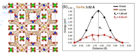 (a) Three-dimensional Fe-ion migration pathway and (b) energy profile diagram showing activation energies for both linear and curved pathways.