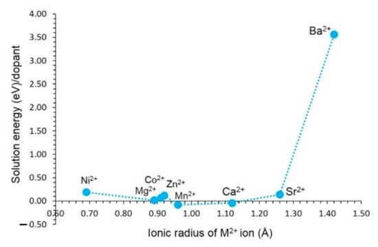 Solution energy of MO (M = Ni, Co, Mn, Mg, Zn, Ca, Sr, and Ba) with respect to the M2+ ionic radius.