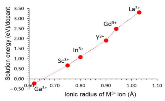 Solution energy of M2O3 (M = Ga, Sc, In, Y, Gd, and La) with respect to the M3+ ionic radius (charge compensation: Fe interstitial according to Equation (17)).