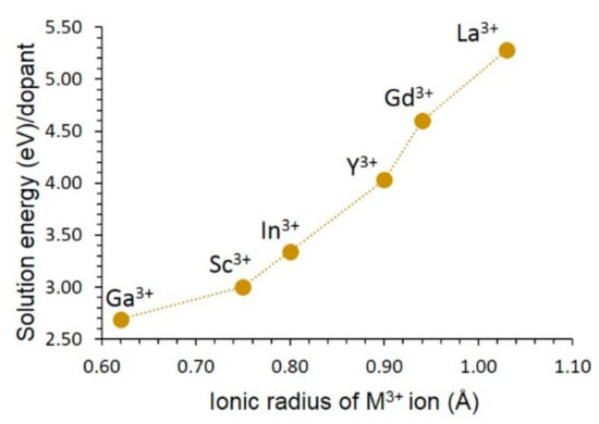 The most favourable solution energy dopant is the Ga3+ although its solution energy is 2.69 eV (see Figure 6). This doping process should be carried out at high temperatures. Solution energy increases with increasing ionic radius. The most unfavourable dopant is the La3+. This is partly due to the larger ionic radius of La3+ than that of the other dopant ions.