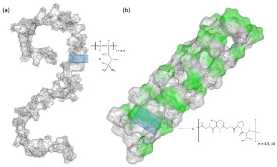 Initial structures of (a) a single chain of PNIPAM and (b) a β-spiral model of (VPGVG)18 ELPs, where the β-turns are colored in green and the coils are colored in gray. Details of schematic structures are showed in supporting information. Blue shaded boxes and schematic chemical drawings represent the structure of (a) PNIPAM monomer and (b) VPGVG pentamer.