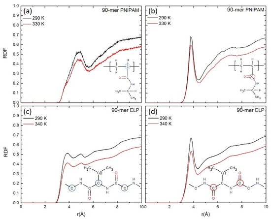 Thermoresponsive polymers, such as poly(N-isopropylacrylamide) (PNIPAM), and biomacromolecules, such as elastin-like polypeptides (ELP), undergo liquid–liquid phase separation into polymer-rich phase and water-rich phases upon heating to above their lower critical solution temperature (LCST) [1]. For example, the LCST of (PNIPAM)n is about ~305 K [1,2,3,4], and LCST of ELPs is between ~300 K to ~400 K [5,6,7,8,9]. Unlike PNIPAM, LCST of ELPs with the canonical Val-Pro-Gly-Val-Gly ((VPGVG)n) sequence depends on its molecular weight [10,11,12,13,14,15,16,17]. Many experimental and computational studies have investigated the origin and mechanism of LCST transition in ELPs [5,18,19,20,21,22,23,24,25,26,27] and in PNIPAM and its architectures [3,4,28,29,30,31,32,33,34,35,36]. For PNIPAM, the LCST transition is attributed to the breaking of a cage-like structure of water molecules around its hydrophobic groups due to the gain in the entropy at a temperature greater than its LCST [4,37,38,39,40,41]. With an increase in temperature, the entropy term dominates the enthalpy of hydrogen bonds between polar groups of PNIPAM and water molecules, which leads to a more stable globular conformation of PNIPAM above its LCST. Indeed, coil–globule transition of PNIPAM investigated by Fourier transform infrared (FTIR) spectroscopy shows that in a globular conformation, only 13% of the C=O groups are dehydrated and form intra- or inter-chain hydrogen bonding, while 87% of C=O groups remain hydrogen bonded with water even in this globular state [42]. Maeda et al. revealed partial dehydration of PNIPAM chains resulting in formation of intra- and inter-chain hydrogen bonding between N–H groups in globular conformation [42,43,44,45]. In the case of (VPGVG)n ELPs, the LCST phase behavior is observed as a collective phenomenon that originates from the correlated gradual changes in a single polypeptide structure and the abrupt change in structure and properties of water around the peptide. This has been attributed to a competition between peptide−peptide and peptide−water interactions [23,25,26,27]. Specifically, simulation studies show that the molecular collapse of ELPs happens as a gradual transition in a well-defined temperature region, indicating a shift from extended to contracted structures with increasing temperature [22]. These aforementioned studies on PNIPAM and (VPGVG)n ELPs suggests that their LCST mechanisms could be different. Investigating the nature of their LCST behaviors is important for the design of new soft materials with controllable functionality that can be used in a variety of applications including tissue engineering, electrophoresis, and drug delivery [46,47,48,49].