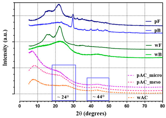 X-ray diffraction patterns of fresh biomasses (pF and wF), biochars (pB and wB), and activated carbons (pAC_meso, pAC_micro, and wAC). The patterns of pF, pB, wB, and wAC were published in Ref. [10].