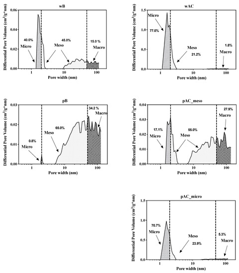 Activation causes a significant increase in surface area. Both nitrogen adsorption measurement and pore size distribution analysis (Figure 2) highlight a mainly meso-microporous structure in all the activated carbons. The amount of the activating agent used for the synthesis of the three activated carbons, wAC, pAC_micro, pAC_meso, strongly affects the pore size distribution. In fact, when the KOH:biochar ratio of 4:1 is used, samples characterized by a dominant microporous structure are obtained. Indeed, in wAC and pAC_micro, the microporous volume is preponderant, contributing to 77.0 and 70.7% of the total pore volume, respectively. For these samples, the surface areas are the largest observed, i.e. 2835 and 2365 m2/g. Instead, the KOH:biochar ratio equal to 2:1, used for the preparation of pAC_meso, leads to a predominantly mesoporous structure, with pore dimensions between 2 to 50 nm (55% of the total pore volume), the microporous volume being only 17.1% of the total pore volume. Correspondingly, for this sample the surface area is only equal to 479 m2/g, which is anyway much higher than that of the corresponding biochar.