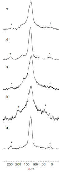 13C SPE MAS spectra of wB (a), wAC (b), pB (c), pAC_meso (d), and pAC_micro (e). Sidebands are marked with asterisks.