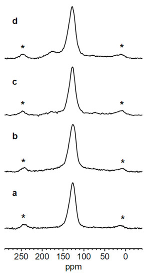 Figure 5 shows the 13C SPE MAS spectra of the samples under investigation. A broad arene/alkene spectral envelope, approximately centered at 125 ppm, dominates all the spectra. Additionally, in Posidonia samples, a low intensity signal centered at 167 ppm for the biochar (Figure 5c) and one at 175 ppm for pAC_meso (Figure 5d) can be detected. The former signal is due to the carbon atoms in calcite [32], whereas the latter is due to carboxyl carbon atoms [33,34]. It is worth noting that, when studying the wAC sample, we experienced difficulties in adjusting the tuning and matching conditions on the probe together with arcing phenomena, which are related to sample conductivity. This results in broader line widths and a low signal-to-noise ratio.