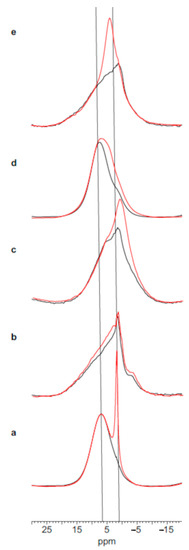 1H MAS spectra of wB (a), wAC (b), pB (c), pAC_meso (d), and pAC_micro (e) as prepared (red lines) and after heating at 150 °C for 12 h (black lines). The vertical lines serve as a visual guide for the positions 1.7 and 7 ppm.