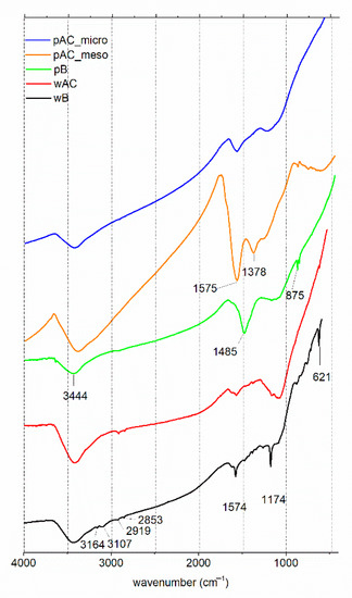 The pB spectrum differs from the wB and the wAC spectra, showing a relatively strong and broad band at 1485 cm−1 and a narrow peak at 875 cm−1. These peaks have been observed in submicrometric calcite particles [43]. The calcite signals are absent in the activated carbons prepared from Posidonia, that is, pAC_meso and pAC_micro, indicating that the activation process followed by washing with an HCl aqueous solution removes the calcite originally present in the pB sample.