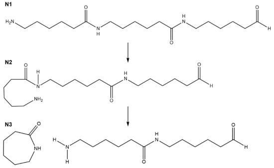 Chemical structure of the substrate (N1), intermediate structure (N2) and the final product (N3) of the nylon 6 thermal degradation process; the colors of the spheres are as follows: black—carbon, light grey—hydrogen, red—oxygen, blue—nitrogen.