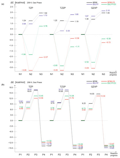 The results obtained for different functionals (black and blue lines in Figure 6) are approximately consistent for different basis sets; for nylon 6 structures, a slight increase in relative electron energies is observed with the increase in the size of the basis set. Whereas for different functionals with dispersion correction the results’ consistency with the size of the basis set is kept only for PHB structures, for nylon 6 structures only relative electron energies calculated by the use of BP86 functional remain nearly unchanged.