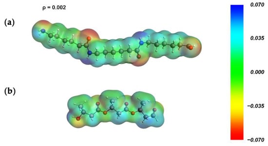 Molecular electrostatic potential map of (a) nylon 6 and (b) PHB models.