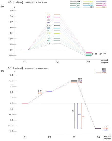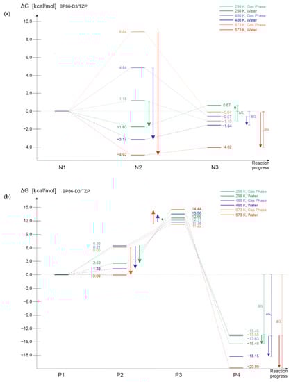 The rise of temperature leads to the increase of relative Gibbs free energies of intermediate structures for both polymers; however, the increase is more considerable in the case of nylon 6 (the top panel in Figure 9). Importantly, the growth of relative Gibbs free energy is proportional to the rise of temperature and does not change even after crossing the degradation temperature of the polymer (280 °C for nylon 6 [18], 180 °C for PHB [11]). Relative Gibbs free energies of final products remain nearly unchanged during the rise of temperature. Despite expectations, the rise of temperature singly does not lead to the spontaneity of the process.