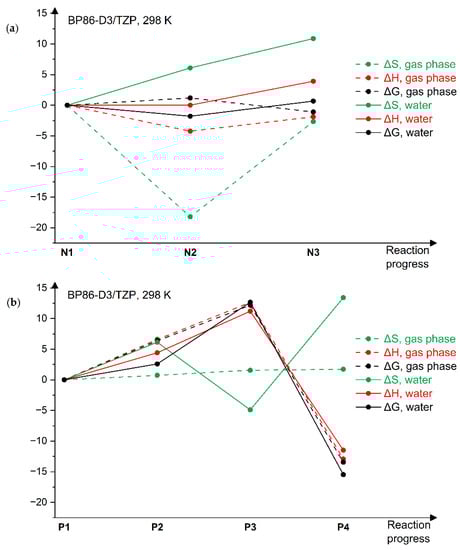 The relative entropy of nylon 6 increases when a solvent is added, therefore easing the reaction to proceed. The rise of relative enthalpy, on the contrary, determines the additional energy essential for the reaction’s progress. Solvent presence affects the relative enthalpy and entropy of polyhydroxybutyrate differently. The increase in relative enthalpy is nearly constant until the second intermediate structure (P3), afterwards it rapidly falls till the final product. Relative entropy changes clarify the reason for the possible spontaneity of the PHB thermal degradation last step.