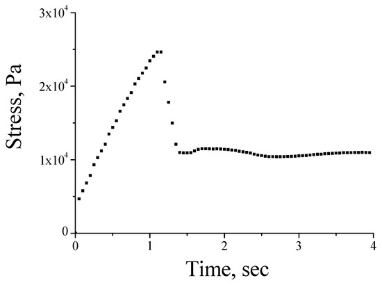 To evaluate the adhesive properties of coatings formed from PDADMAC of different molecular weights, the dynamometry method was used. Figure 3 shows a typical stress versus time curve for the polycation under study. The maximum value of the applied stress (peak value) was taken as the characteristics of the adhesive properties of the PDADMAC film.