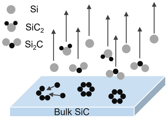The graphene layers are grown on a 4H-SiC (0001) silicon carbide substrate by thermal decomposition. The SiC is previously degassed at 700 °C for 10 h by applying current to both ends of the sample holder, keeping the pressure of the chamber at 10−9 mbar. The degassing procedure ensures the removal of impurities absorbed on the surface. After degassing, we increase the direct heating current to 1.21 A (power reaches 26 W). The color of SiC becomes brighter and brighter until it glows orange-white light. Using a pyrometer (infrared temperature measurement), we acquire the temperature of 4H-SiC, which is about 1300 °C. Due to the increasing temperature, the pressure in the chamber will be as high as 10−8 mbar. We then keep the sample at this temperature for approximately an hour. At this stage, C-Si bonding on the surface is decomposed. After the decomposition, the silicon atoms escape from the surface while the C atoms are left on the surface and reconstructed, forming graphene layers on top of the SiC substrate. The 1st layer of the reconstruction of the C atoms is a complex buffer layer that consists of a non-conducting, carbon-rich interfacial layer. The buffer layer, different from graphene, partly has covalent bonding with the bulk SiC [26,27]. The scheme demonstrating the formation process of graphene on SiC substrate is shown in Figure 1.