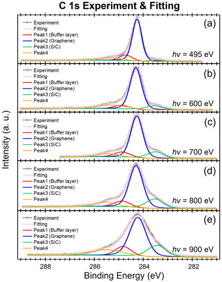 In Figure 4, it is clear that the green component is increasing with increasing photon energy (hv). Therefore, the green component is assigned to SiC. On the other hand, The main component (blue) can be easily assigned to graphene due to the decreasing ratio while increasing photon energy (hv). Next, we have the SiC component (green) behave similar to the graphene component (blue). We finally add another peak to present the other factors. The peak assignment is in accord with the previous studies [33,34,35,36]. We then use these four components, labeled as peak1 (buffer layer), peak2 (graphene), peak3 (SiC), and peak4 (other), to fit the C 1s curves.