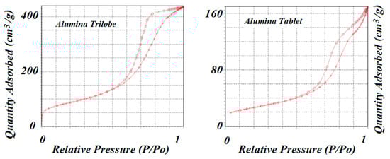 The two supports used to prepare the catalysts were alumina trilobe and alumina tablet. Surface area and pore volume distribution were determined by experimental adsorption of N2 at −196 °C using the Micromeritics 3Flex instrument. Results are shown in Figure 3 for both supports. In both cases, the adsorption isotherms corresponded to type IV according to the IUPAC classification that corresponds to mesoporous materials. Alumina trilobe, however, showed a larger amount of N2 adsorbed than the alumina tablet, and that could be related to a higher number of pores as shown in Table 1 for the total pore volume (VpT). The desorption of N2 at the same temperature of the adsorption process did not coincide and produced the formation of two hysteresis loops: H1 type in the case of alumina trilobe that was related to a narrow range of uniform mesopores, and H3 type in the case of alumina tablet that was related to pores within the aggregation of plate-like particles [38].