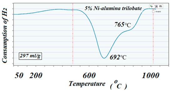 The ICCS can precisely detect, elucidate, and quantify the amount of H2 consumed during the reduction reaction. Profiles of TPR on the two catalysts showed different behaviors; the catalyst with high surface area support showed mainly two well identified peaks at 635 and 725 °C, while the catalyst with low surface area support showed lower reduction peaks, 297 and 345 °C, respectively. The amount of H2 consumed in these two TPR experiments (close to a 300 cm3/g theoretical value for consumption of H2 by 1 g of pure NiO) suggested that all the used NiO that was deposited on the supports remained in the catalysts with no apparent reaction with the alumina to produce the unreducible spinels NiAl2O4. These results could well indicate the role of the support in interacting and stabilizing the metal active particles on the surface [39,40,41]. In the same way, the high dispersion of the active particles exhibited by the high surface area catalyst justified the higher performance of the catalyst to produce CH4, as can be seen below.
