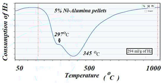 To elucidate the effectiveness of such important tools (a combination of ICCS and the mass spectrometer) for this study, two series of Ni-supported catalysts with about 5 wt.% of metal were prepared using the classical impregnation method. The supports used were an alumina trilobe (high specific surface area material, 310 m2/g) and an alumina tablet (low specific surface area material, 92 m2/g); both aluminas were from Grace Davison Co. 1989. Equivalent amounts of nickel nitrate (Ni(NO3)2·6H2O from Aldrich) were considered for the preparation of the catalysts. The difference in the supports’ surface areas was thought to have a direct impact on the dispersion of the active species. Each alumina was first dried under a vacuum for 12 h and was then poured into the nickel solution that was prepared to have an approximate amount of 5% NiO. The mixture was stirred at ambient temperature until no more liquid was left over the solid. The freshly prepared catalysts were washed with DI water. The washing liquid was a rather pale green, which indicated that all the NiO immigrated within the pores. The precursor catalysts were dried and calcined at 500 °C for 12 h with a minimum ramping rate (2 °C/min). The final approximate loading on NiO was determined by using the ICCS system and performing TPR analyses, with TPR being a bulk analysis that reduced all NiO present in the catalysts. The amounts of consumed H2 were 297 and 293 cm3/g, respectively, and were very close to the theoretical value for 1 g of pure NiO that consumes 300 cm3/g of H2 for its complete reduction to nickel metal (see Equation (6)). It was concluded from these first results that almost all NiO present in the catalysts was reduced and found to be about 5 wt.% approximately for both catalysts.