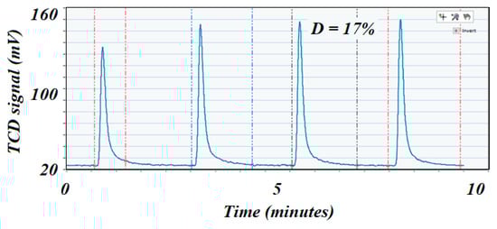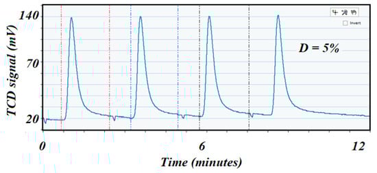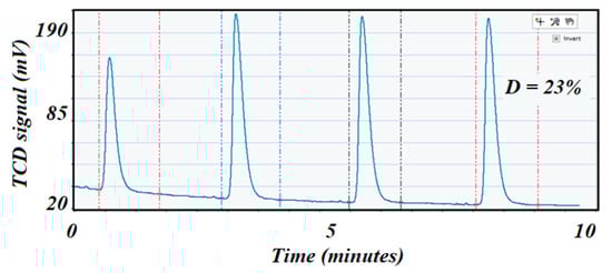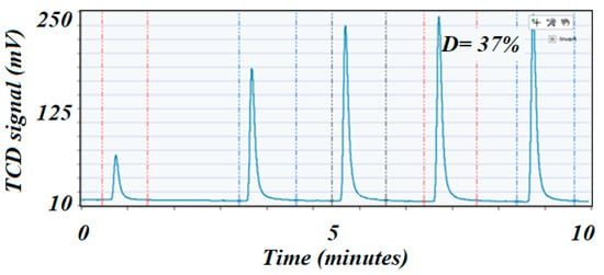 The ICCS performed pulse chemisorption by using a pre-calibrated loop of about 0.5 cm3 up to 20 bar of pressure. The analysis was carried out at 35 °C at 1 bar and was used before and after the reaction to determine dispersion. Thus, comparing dispersion values before and after reduction would indicate sintering if the post-reaction value had depleted, which was one of the deactivation phenomena of the catalyst. Dispersion was determined according to Equation (7) and highly depended on the amount of H2 adsorbed. For this test, catalysts were reduced at 500 °C for 4 h and 20 bar of pressure and monitored using the TCD signal of the ICCS to ensure complete reduction of the catalyst. It was found that after 4 h of reduction, the TCD signal returned to base line, indicating the maximum amount of NiO that could be reduced in these conditions. Upon completion of the reduction, the catalysts were flushed with pure Ar for 1 h at the reduction temperature to ensure a complete removal of any H2 that could have been left after reduction. The temperature was then brought down to 35 °C and pulses of 10% H2-Ar were admitted to the sample until similar peaks were detected and quantified by the TCD, indicating saturation. The results are shown in Figure 6 and Figure 7, respectively.